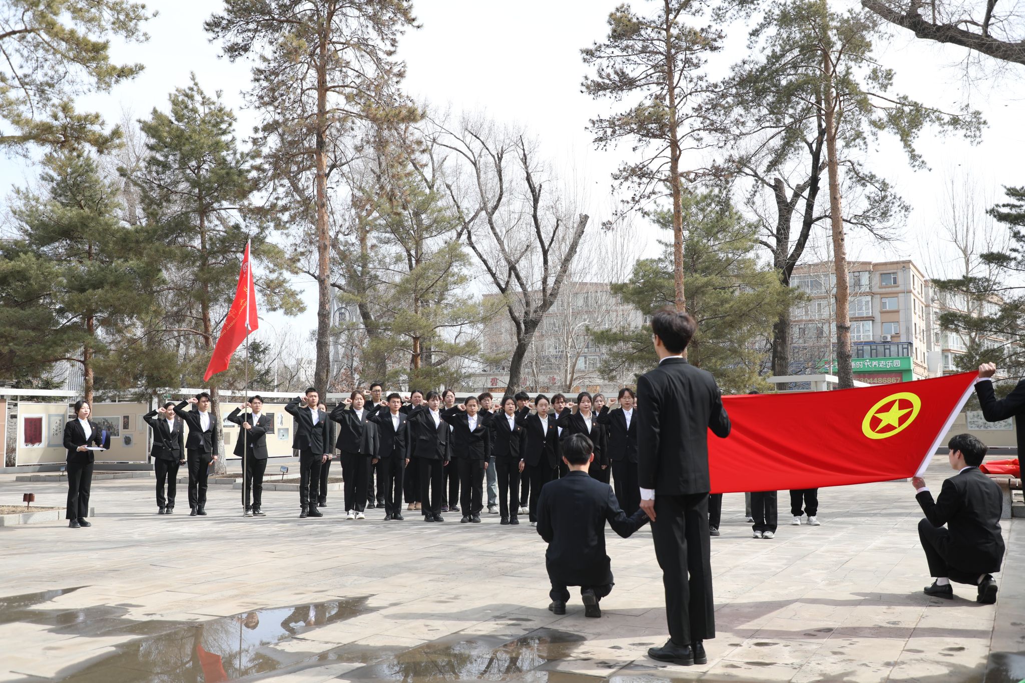 青马学员代表、学生骨干徐浩然现场讲述微团课,带领同学们共同回眸历史,深切感怀和传承英烈精神。在这座曾经与长春共存亡的“南大营”,同学们面向团旗,举起右拳,庄严宣誓,重温入团誓言。声声誓言掷地有声,不仅是追寻先烈足迹,更是牢记先辈嘱托、传承红色血脉,长师青年正以实际行动践行青春担当。