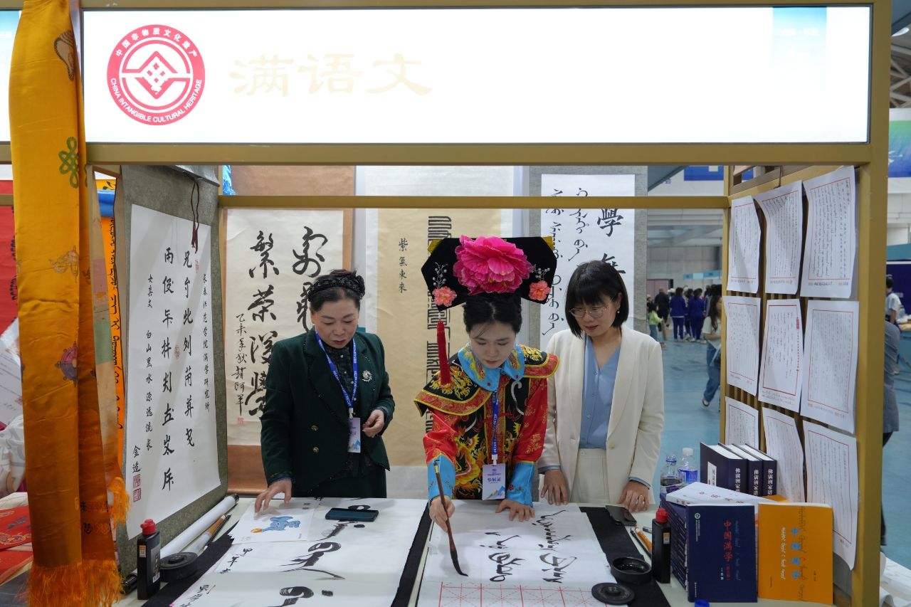 展会现场,为使“满语文”非遗展效果更佳,该项目代表性传承人刘厚生教授展示了教研新成果——满汉文读写卡片。女真文、满文多种书法作品深受参观者喜爱。我校满语文专业师生吕萍、张楚南、葛晓妍、关晟龙进行活态传承,通过现场书写满文条幅及图书签名,手把手教写满文,展示了濒危文字的魅力,科普了满族文化。本次参展首届东北图书博览会,体现了我校“满语文”特色学科建设,是对非物质文化遗产保护传承的又一成果。
