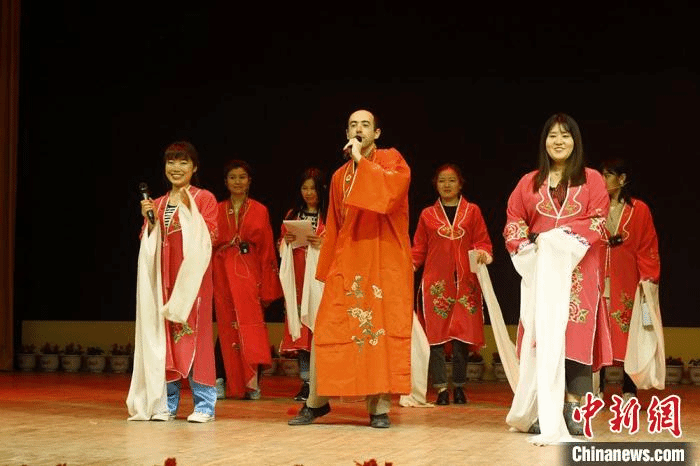 台上,一位身着罗裙的“唐朝女子”怀抱琵琶,手指轻抚琴弦,婉转悠扬的乐声响起。此时,身着青衫、风度翩翩的“白居易”走上台……在法国教师马天宇(Matthieu Leblanc)的课堂上,一场别开生面的法语版戏剧《琵琶行》正在上演。