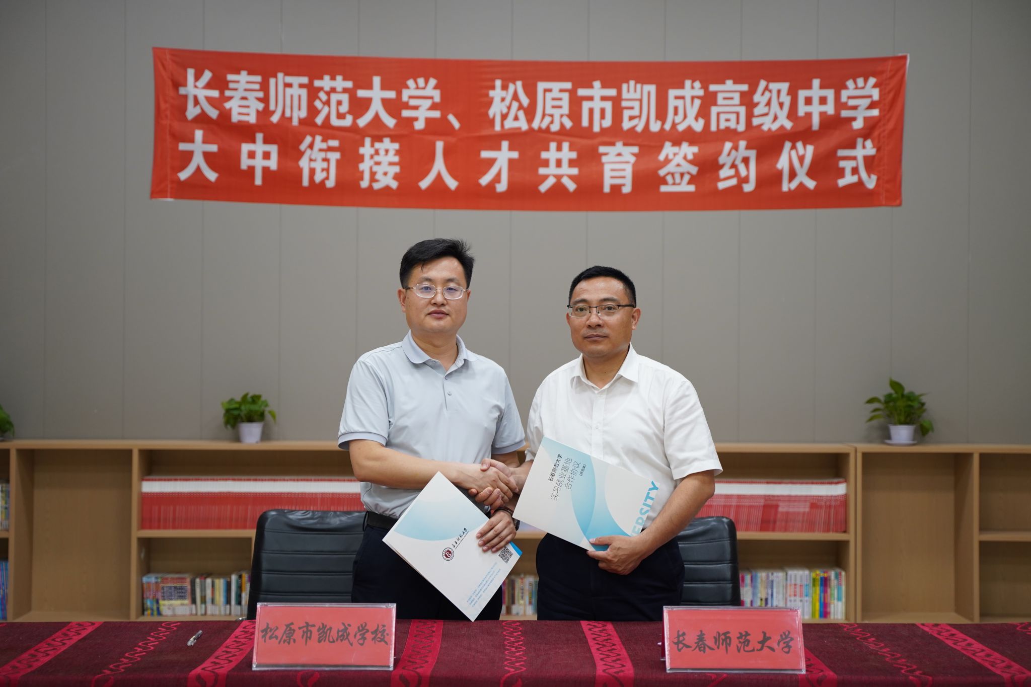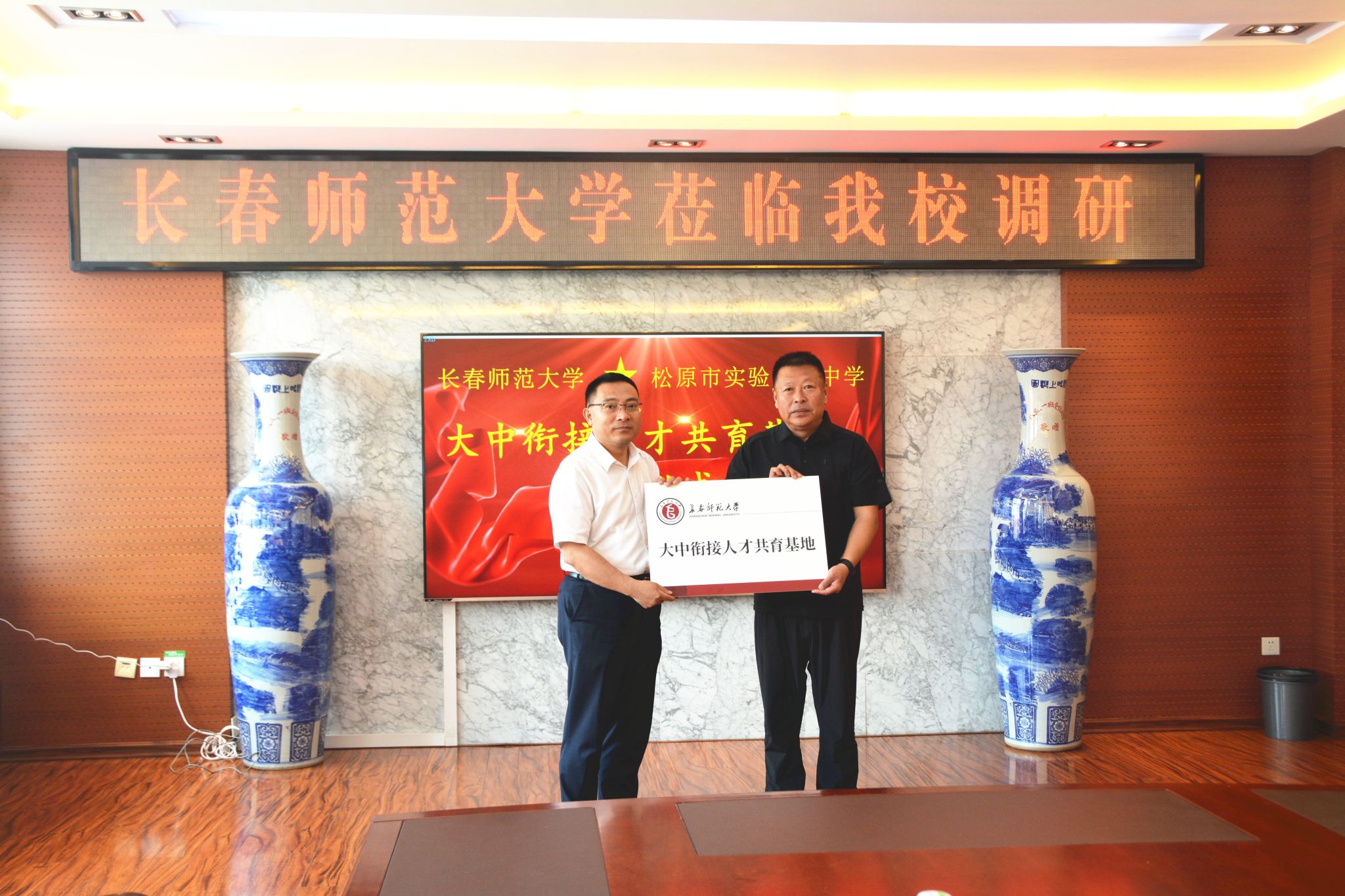 在与松原市实验高级中学举行的专题座谈会上,胡德超回顾了学校百年发展历程,系统介绍了学校整体办学情况,重点围绕本科人才培养体系、教育教学改革实践及顶岗实习模式等方面进行了深入交流,同时还详细介绍了学校各专业往年招生录取情况。经充分研讨与磋商,双方达成共识,签署《大中衔接人才共育协议》并举行授牌仪式。