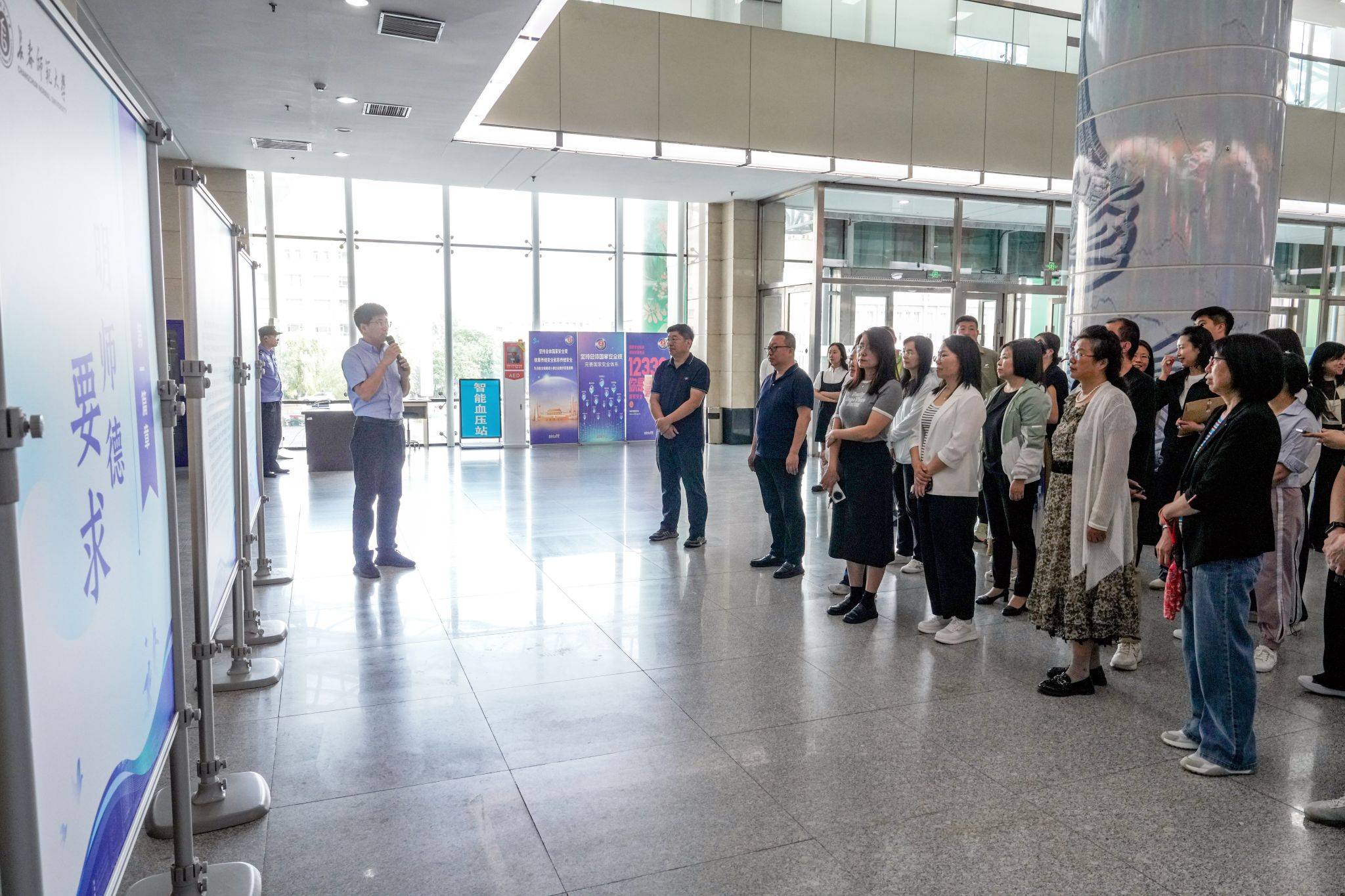 本次教育展共安排29场集体参观,实现了学校23个党总支(分党委)、1600余名教职工全覆盖。本次教育展设置了“明师德要求”“学师德楷模”“守师德底线”三个篇章,形成了“理论引领—榜样示范—警示反思”的闭环教育体系,推动了师德规范入脑入心入行。第一篇章以习近平总书记关于师德师风的重要论述为纲,系统梳理习近平总书记关于“四有好老师”“四个引路人”“教育家精神”等重要论述,通过系统宣讲和学习,进一步筑牢广大教师的思想根基。第二篇章聚焦先进榜样,通过展示人民教育家、全国教书育人楷模、全国优秀教师等先进典型代表的感人事迹,进一步号召广大教师以榜样为镜,争做“大先生”。第三篇章聚焦违反《新时代高校教师职业行为十项准则》,选取40个高校系统师德失范行为典型案例,用高校教师的“身边事”教育全体教职工,有效发挥警示、震慑的作用。