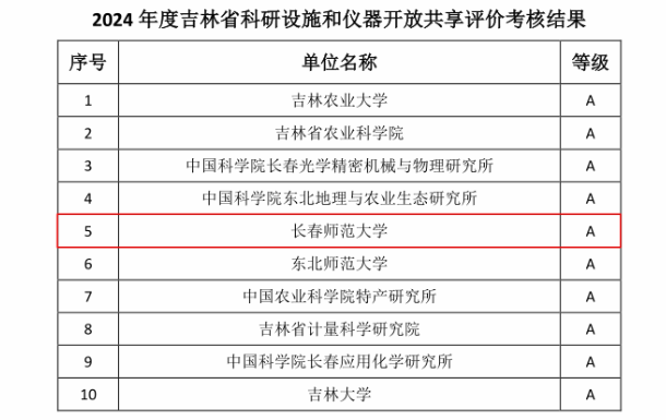 近日,省科技厅通过吉林省重大科研基础设施和大型科研仪器网络管理平台发布了“2024年度吉林省科研设施和仪器开放共享评价考核结果”,我校再次荣获“A”等次。
